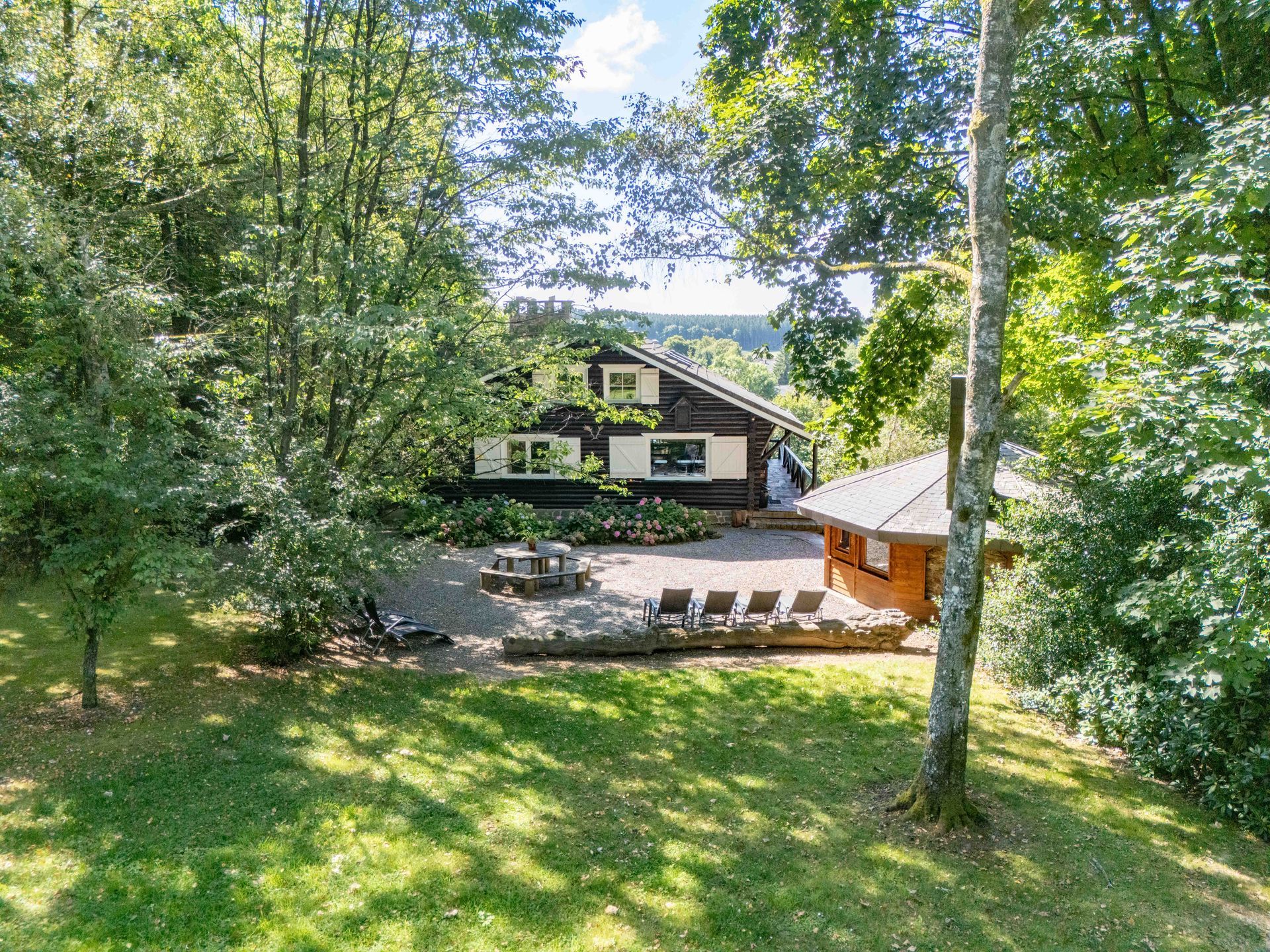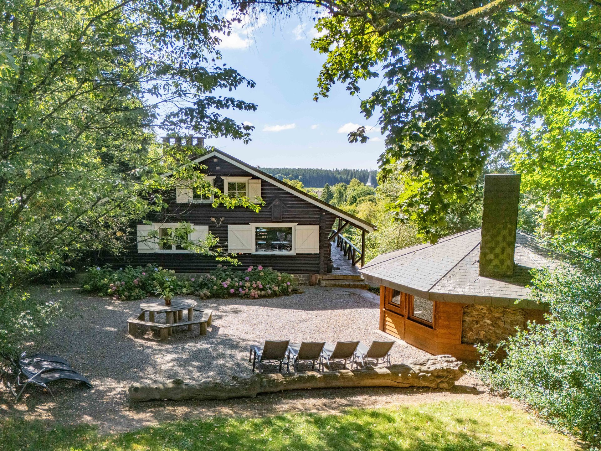 in volledige privacy (geen buren), omgeven door natuur (Ardeens wild op het domein), op heuvelflank met uitzicht. In nabijheid van dorpsschool (1 km); buurtwinkels (2 km); Durbuy (<18 km).
