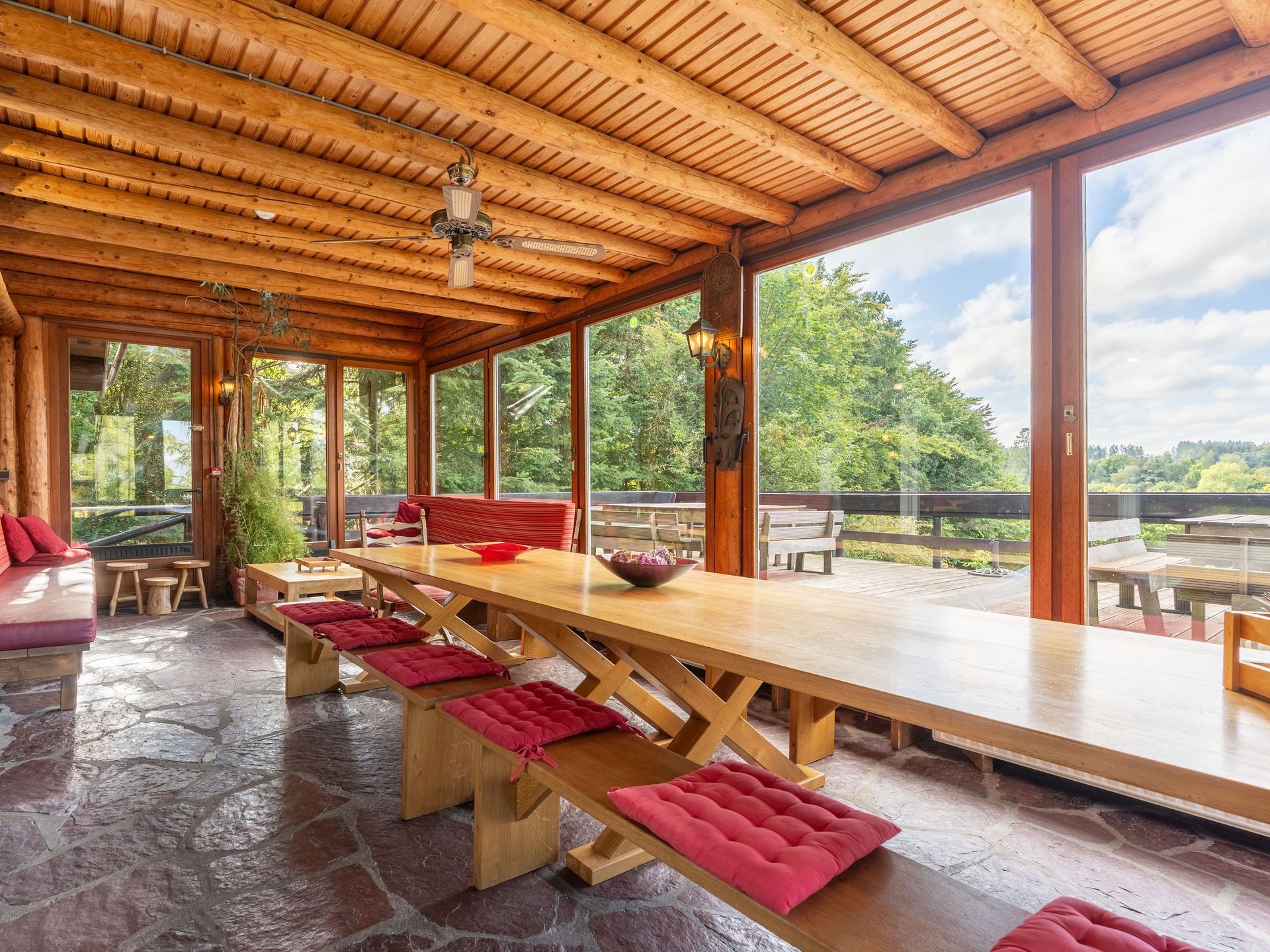 De veranda biedt zicht op het dorp en zijn natuur en is voorzien van een lange eettafel en zithoek;