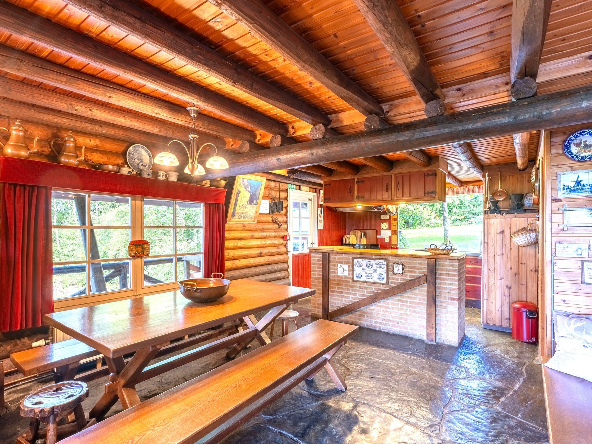 Living met salon, open haard, TV en rustieke bar;